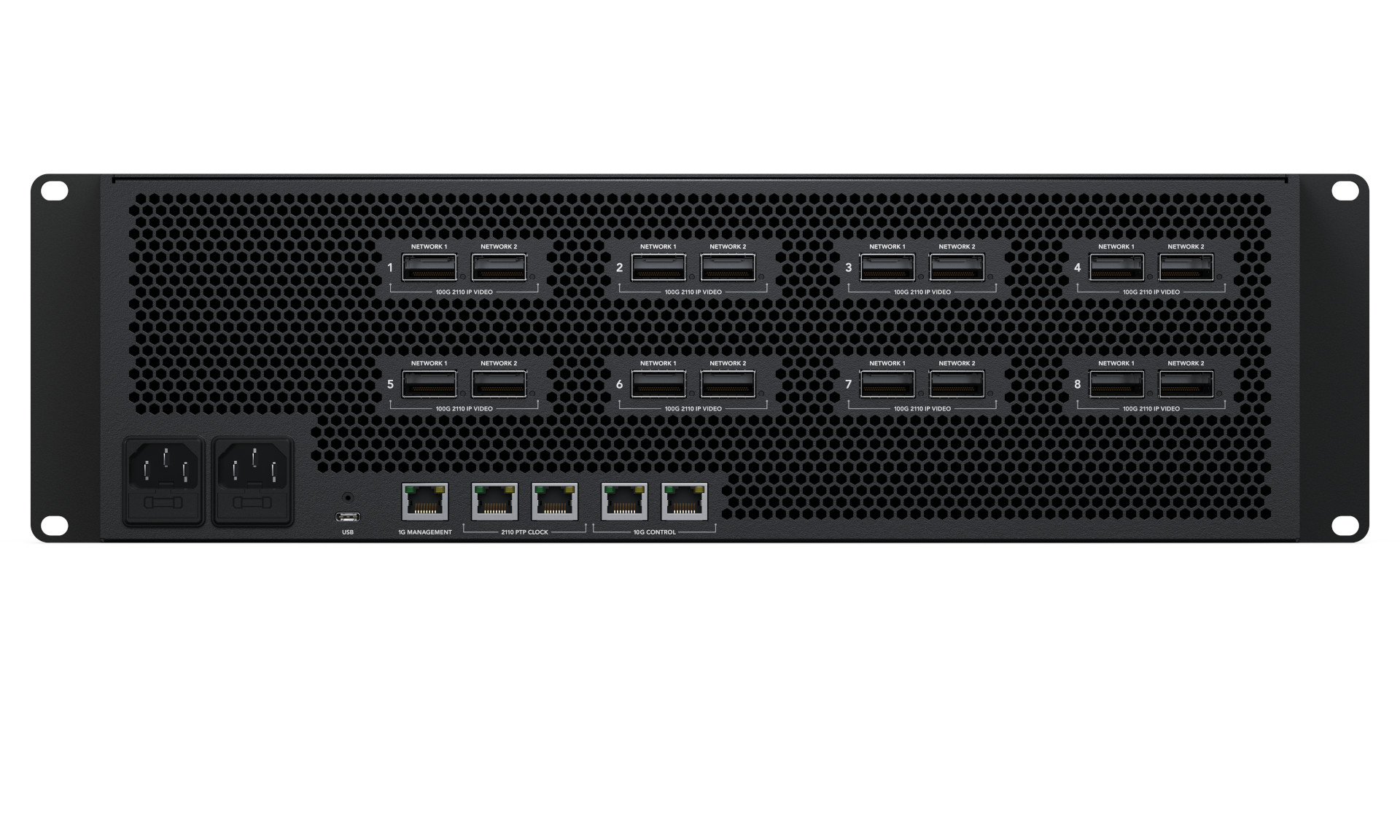 2 x złącza RJ45 Ethernet 10G do podłączania paneli, sterowania NMOS oraz przesyłania multimediów, zapisywania i ładowania presetów.