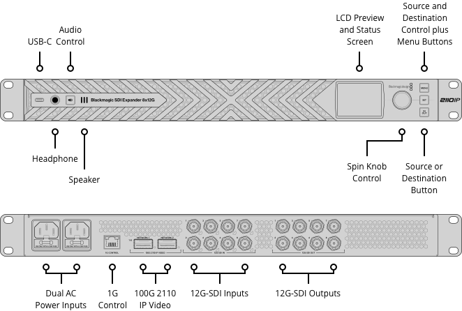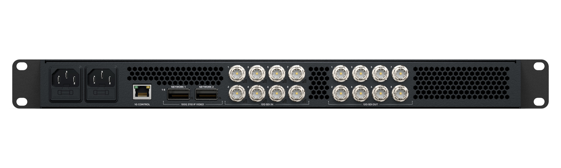 Blackmagic SDI Expander 8x12G umożliwia jednoczesną konwersję w obu kierunkach. Konwertuje 8 niezależnych kanałów 12G-SDI na SMPTE-2110, jednocześnie konwertując oddzielny zestaw 8 kanałów SMPTE-2110 z powrotem na 12G-SDI. To aż 16 kanałów konwersji w jednym racku. Połączenia SMPTE-2110 wykorzystują dwa porty Ethernet 100G, zapewniając pełną redundancję SMPTE-2022-7. Dla niezawodnej emisji dostępne są również oddzielny port Ethernet do sterowania NMOS oraz dwa redundantne źródła zasilania AC.